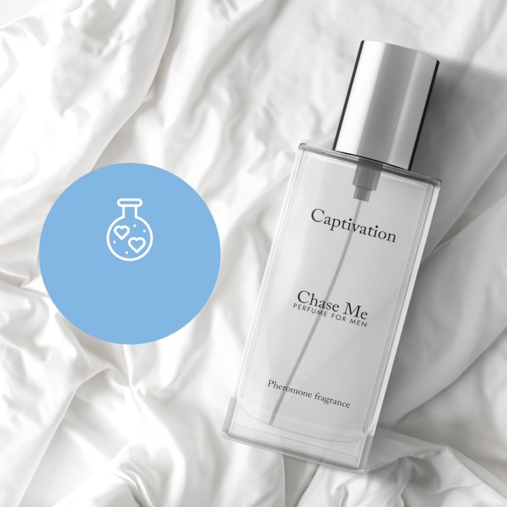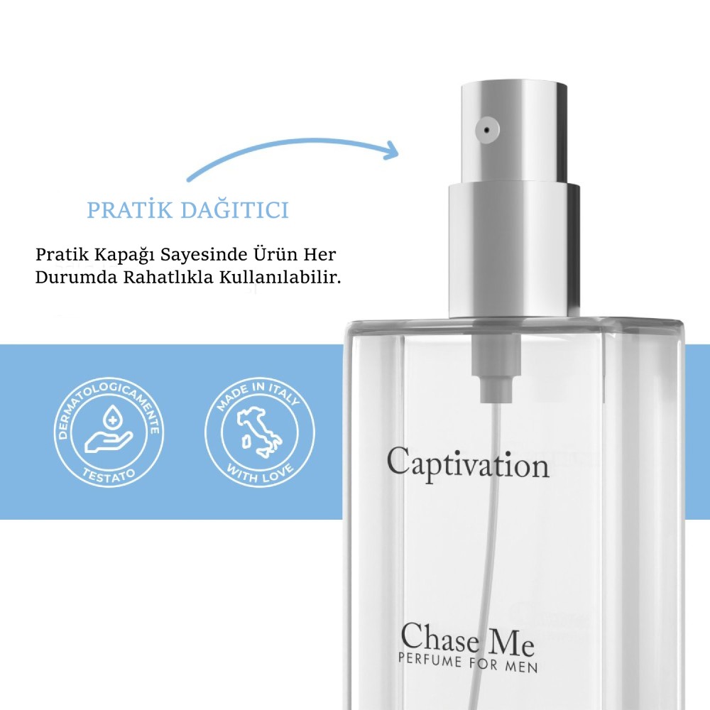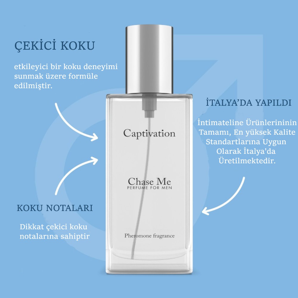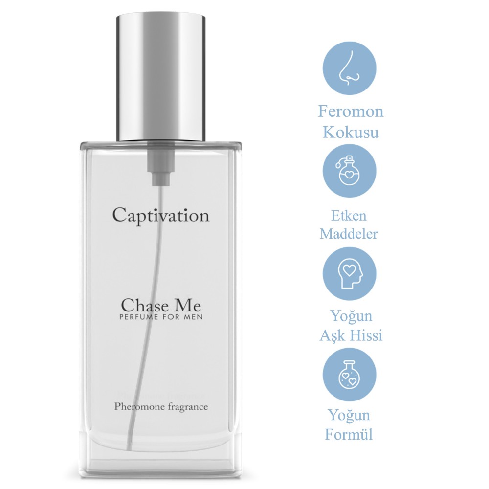 Captivation Chase Me - Men, feromon içeren şehvetli ve büyüleyici bir parfümdür. Çekici ve hipnotiktir, havaya karşı konulmaz bir koku yayar.