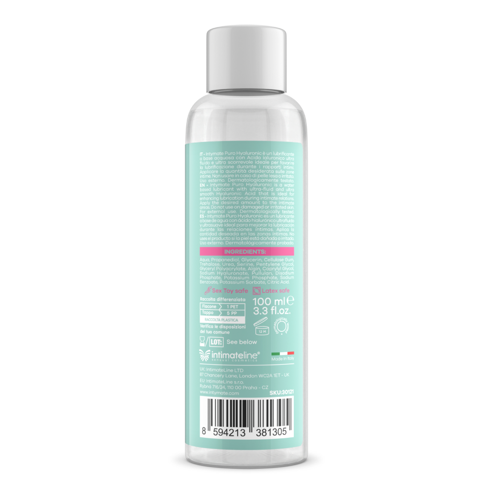 Intymate - Puro Hyaluronic, 100 ml, yakın ilişkiler sırasında kayganlığı artırmak için ideal olan ultra akışkan ve ultra pürüzsüz Hyaluronik Asit içeren su bazlı bir kayganlaştırıcıdır. Hyaluronik asit bazlı bu ürün, yoğun nemlendirme sağlar ve hassas bölgeleri tahrişe ve mikro travmaya karşı korur.