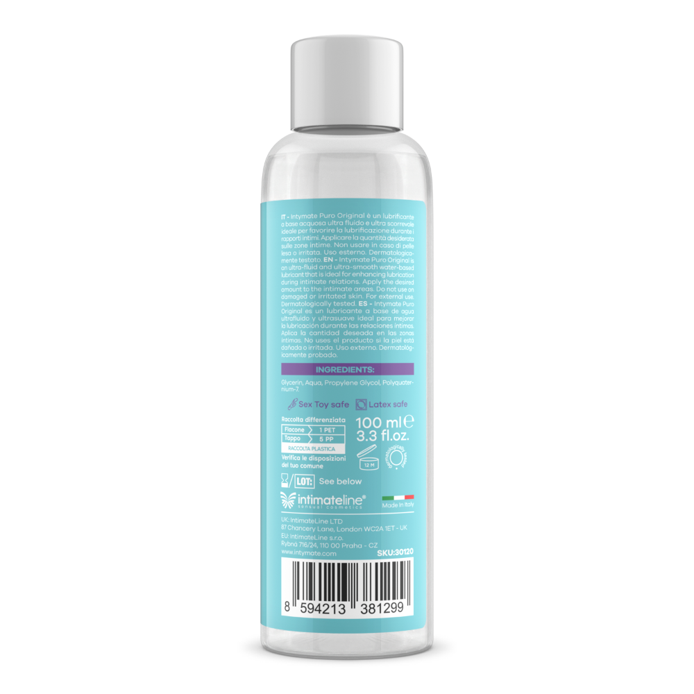 Intymate - Puro Original, 100 ml, cinsel ilişki sırasında kayganlığı artırmak için formüle edilmiş, ultra akışkan ve ultra pürüzsüz su bazlı bir kayganlaştırıcıdır. Hem anal hem de vajinal ilişkiler için ideal olan Puro Original, doğal kayganlığın yetersiz olduğu durumlarda cinsel ilişkiyi kolaylaştırabilir. Bu ürün kolayca durulanır ve tüm cilt tiplerinde leke bırakmaz veya iz bırakmaz.