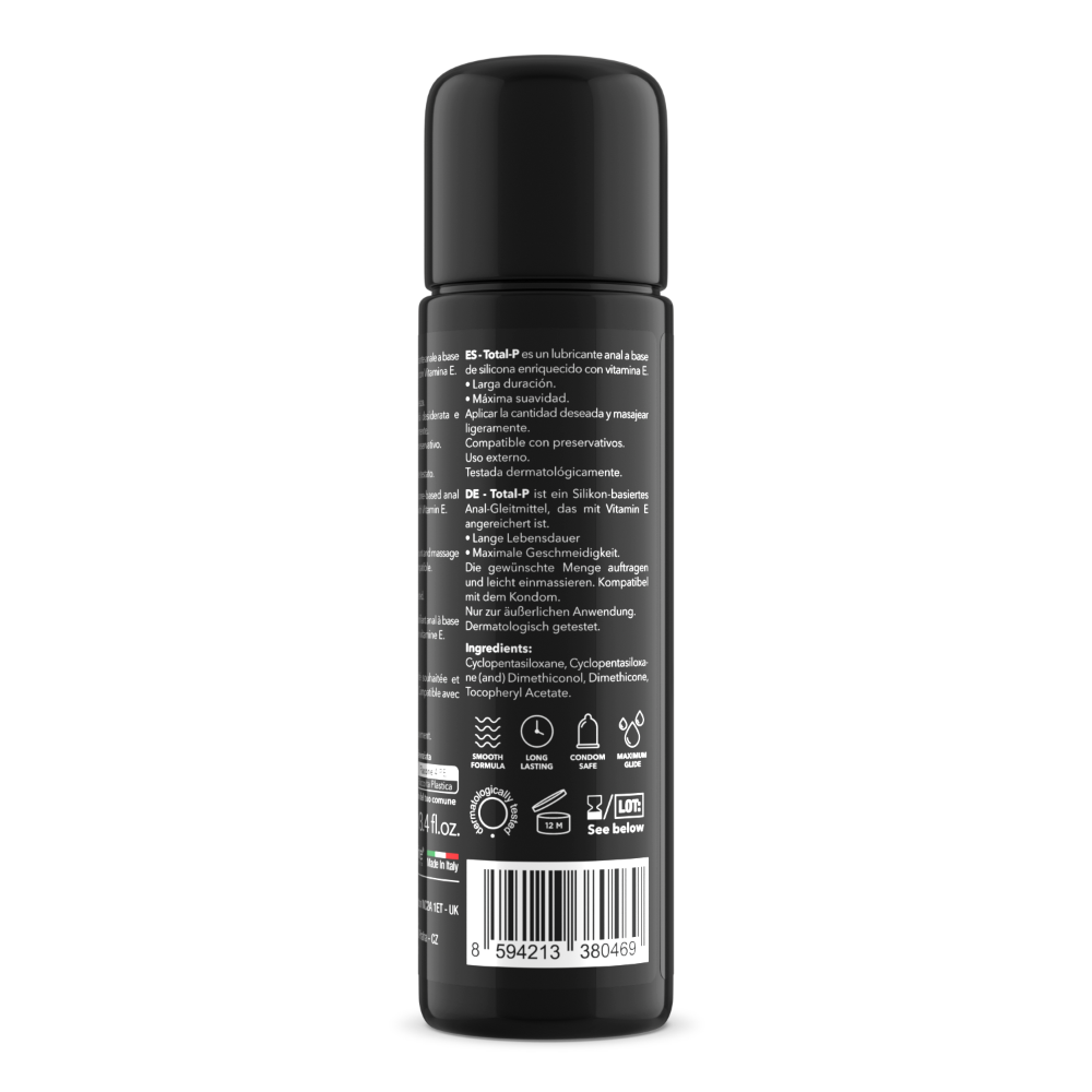 Total-p, silikon bazlı bir genital kayganlaştırıcıdır. E Vitamini ile zenginleştirilmiş özel formülü, uzun süreli kayganlaştırıcı, nemlendirici, yumuşatıcı ve rahatlatıcı etki sağlayarak en özel anlarınızda tam bir keyif sunar. Total-P yağ ve koku içermez, leke bırakmaz, yapışkanlık hissi yaratmaz ve lateks uyumludur.